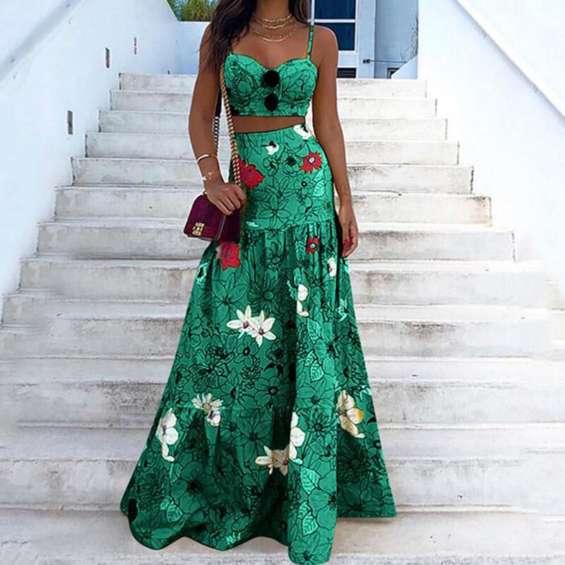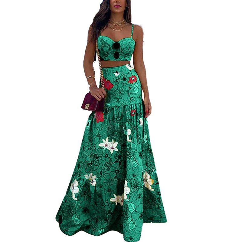 Latest Dress Styke with Floral Print Two Piece Set Maxi Skirt Spaghetti Strap Crop Top Long Skirt Floral Set Women Summer Dress Suits