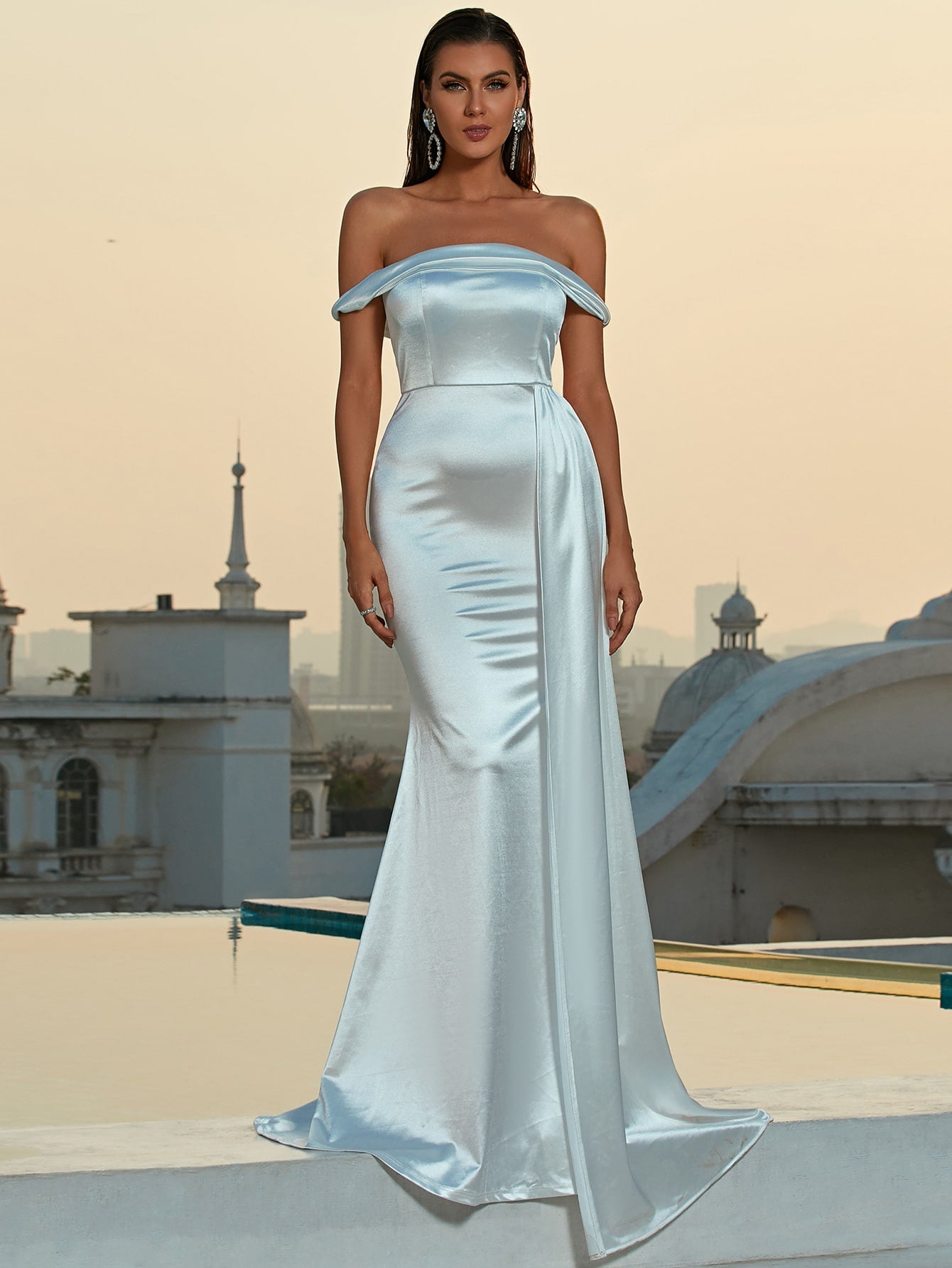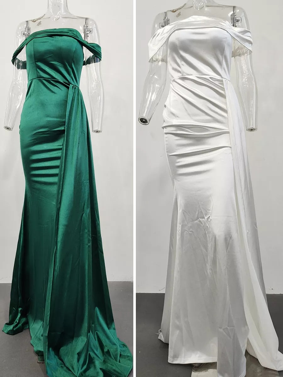 Satin Off Shoulder Draped Side Mermaid Hem Satin Formal Dress