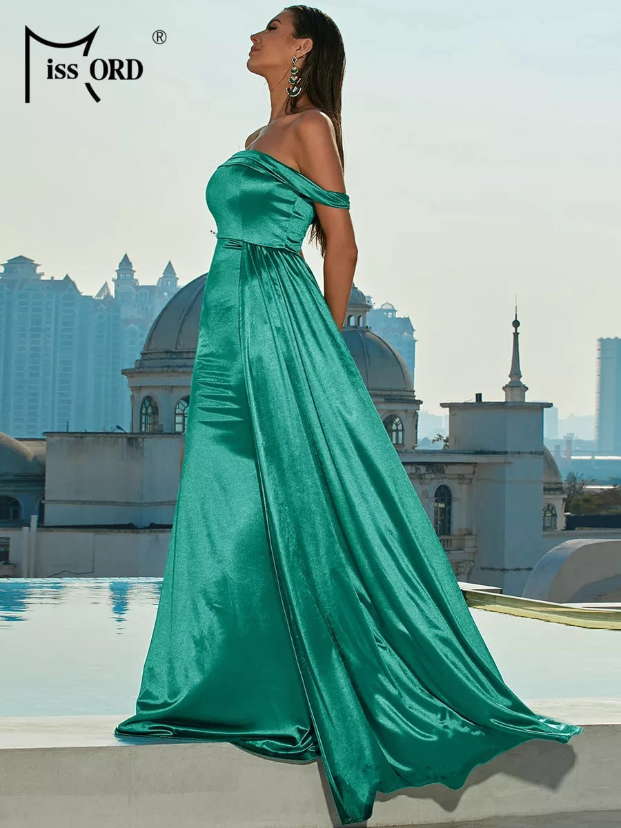 GET THE LOOK✨: Missord Off Shoulder Mermaid Hem Satin Dress Women's Evening Party Gown With Ribbon Royal Draped Formal Summer Green Black White.